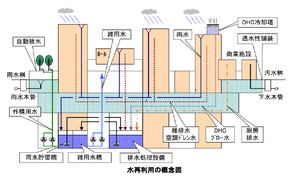 "生活排水を浄化したり、屋根雨水を集めてろ過し、トイレの洗浄水や植栽の散水に使うなど、水資源の有効利用を行っています。これにより雨水利用や排水再利用を行わなかった場合に比べて、上水を40%以上削減しています。"